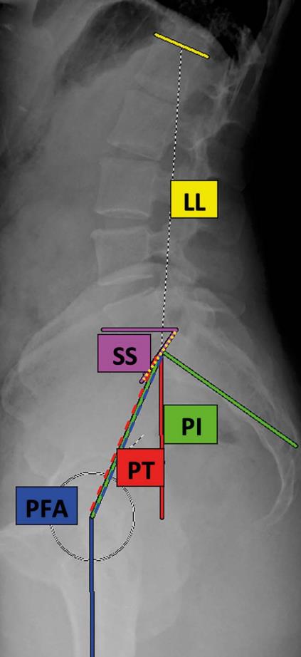 • There were decreases of 4.5° (9%) per decade of age in lumbar flexion (rho, -0.576; p < 0.001) and 3.6° (4%) per decade in hip flexion (rho, -0.365; p < 0.001). ∆LL could be predicted by younger age, low standing PFA, and high standing LL. Standing spinopelvic characteristics were similar between sexes. There was a trend toward men having less hip flexion (90.3° ± 16.4° versus 96.4° ± 18.1°; p = 0.065) and a lower hip user index (62.9% ± 8.2% versus 66.7% ± 8.3%; p = 0.015). BMI weakly correlated with ∆LL (rho, -0.307; p = 0.011) and ∆PFA (rho, -0.253; p = 0.039).