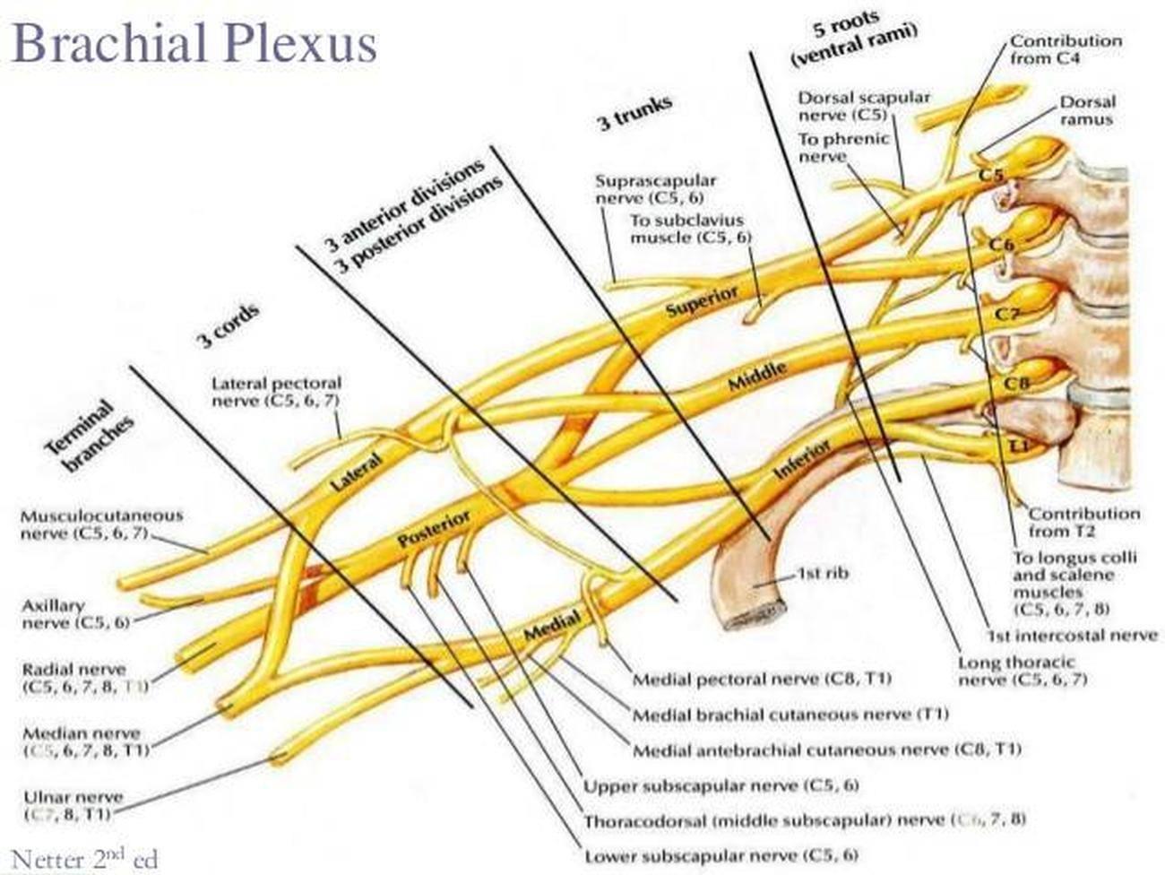 The medial antebrachial cutaneous nerve (C in Figure A) is at risk with cubital tunnel release. It is located approximately 3cm distal to the medial epicondyle.Cubital tunnel syndrome is a compressive neuropathy of the ulnar nerve caused by anatomic compression in the medial elbow. Diagnosis is made clinically with presence of sensory changes to the ring and little finger, intrinsic muscle weakness and a positive Tinel's sign over the cubital tunnel. Treatment may be nonoperative modalities such as bracing or surgical decompression depending on the severity and duration of symptoms, and success of nonoperative treatment. The medial antebrachial cutaneous nerve crosses the surgical field at an average of 3.1cm distal to the medial epicondyleChowdhry et al. reported on the location of the medial brachial cutaneous nerve on the basis of anatomical landmarks. They reported that at about 7cm proximal to the medial epicondyle, there is an arborization of 2 to 3 cutaneous branches. They concluded that knowledge of the anatomy of the course of the medial brachial cutaneous nerve can help the surgeon better plan his or her operative approach to maximize aesthetic benefit and limit nerve injury.Lowe et al. reviewed the posterior branch of the medial antebrachial cutaneous nerve and its course in proximity to the cubital tunnel. They reported that the medial antebrachial cutaneous nerve branches were noted to cross distal to the medial humeral epicondyle 100% of the time at an average distal distance of 3.1cm. They concluded that an understanding of the general position of the medial antebrachial cutaneous nerve branches during ulnar nerve release at the elbow may help to prevent iatrogenic injury to this cutaneous nerve.Figure A is an unlabeled brachial plexus. Illustration A is the corresponding labeled brachial plexusIncorrect Answers:Answer 1: The medial pectoral nerve arises from the medial cord of the brachial plexus to supply the pectoral muscles. It usually pierces the pectoralis minor, then continues to supply mainly the sternocostal portion of pectoralis majorAnswer 2: The medial brachial cutaneous nerve crosses the field 7 cm proximal to the medial epicondyle and arborizes into two to three terminal branchesAnswer 4: The ulnar nerve is a terminal branch of the medial cord of the brachial plexus. It contains mainly fibers from the anterior rami of spinal nerves C8 and T1, but may sometimes carry C7 fibers as well.Answer 5: The median nerve is a branch of the brachial plexus with contributions for the lateral and medial cords and supplies most of the superficial and deep flexors in the forearm, thenar and lumbrical muscles. It also gives sensation to certain areas of the skin of the hand.
