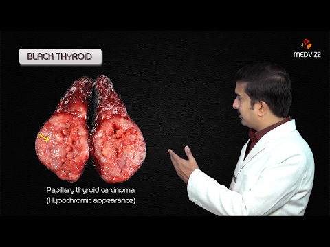 BLACK THYROID — Black thyroid syndrome is diffuse black discoloration of the thyroid noted during gross specimen examination associated with prior minocycline therapy.QClinical manifestations — Patients are typically asymptomatic with normal thyroid function. It is usually noted incidentally Minocycline and other tetracycline derivatives have been implicated as the causative agents, even after exposure as short as 12 days. Pathology — Gross examination shows a diffused black thyroid gland; in contrast, benign and malignant thyroid neoplasms are often hypopigmented .