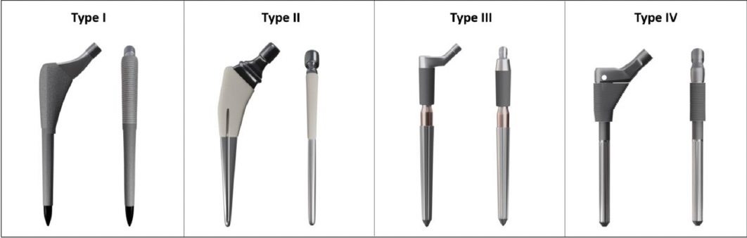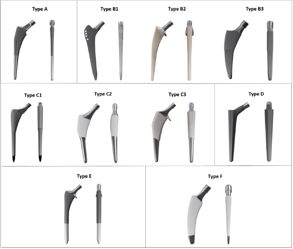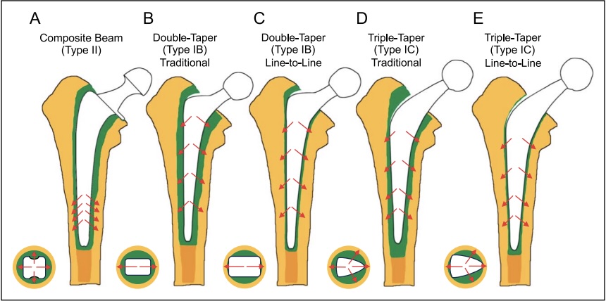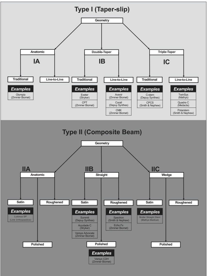 Introduction Types of fixation cement fixation polymethylmethacrylate (PMMA) biologic fixation (cementless fixation) bone ingrowth porous coating bone ongrowth grit-based collared femoral stem helps transfer stress to calcar, reduce early subsidence, and control insertion depth used in both cemented and cementless fixation History cemented fixation first described by Gluck in 1891 Charnley popularized technique in 1950s used cement borrowed from dentists failures in 1980s thought to be due to "cement disease" driving force to perfect cementless techniques cementless fixation used throughout 1900s, with varying results in 1983, FDA approved Anatomic Medullary Locking (AML) implant first microporous surface with potential for bone ingrowth proximally coated stems designed shortly thereafter due to concerns of thigh pain and osteolysis Prevalence of fixation technique increasing trend towards cementless fixation 93% of THA in United States in 2012 were cementless Templating can help achieve proper restoration of biomechanics and avoid complications standard radiograph with a known magnification and calibration marker is used goal is to optimize limb length and femoral offset Indications General indications: Debilitating pain with severe osteoarthritis affecting activities of daily living Failed conservative measures Hip fracture in native hip Avascular necrosis Cemented vs uncemented Dorr classification attempts to guide indications for cemented or uncemented femoral component fixation. Ratio is calculated as canal diameter 10 cm distal to midportion of lesser trochanter divided by inner canal diameter at midportion of lesser trochanter Dorr Classification Ratio Characteristics Suggested Femoral Component Fixation Type A < 0.5 Cortices seen on both AP and lateral XR Uncemented Type B 0.5 to 0.75 Thinning of posterior cortex on lateral XR Uncemented type C >0.75 Thinning of cortices on both views Cemented Acetabular cup fixation porous-coated cementless (preferred) porous-coated hemispheric cementless cemented fixation poor bone quality complicated revision cases Femoral stem fixation both cemented and cementless techniques are acceptable in THA cementless indications highly active young male types of cemented femoral stems type 1 (Taper-Slip) type 1A (anatomic) traditional example: Olympia (Zimmer Biomet) line-to-line type 1B (double taper) traditional examples: Exeter (Stryker) and CPT (Zimmer Biomet) line-to-line examples: Avenir (Zimmer Biomet), Corail (Depuy Synthes), and CMK (Zimmer Biomet) type 1C (triple taper) traditional examples: C-stem (Depuy Synthes) and CPCS (Smith & Nephew) line-to-line examples: TwinSys (Mathys), Quadra C (Medacta), and Polarstem (Smith & Nephew) type 2 (Composite Beam) type 2A (anatomic) satin example: Lubinus SP (Link Orthopaedics) polished roughened type 2B (straight) satin examples: Summit (Depuy Synthes), Accolade C (Stryker), and Versys Advocate (Zimmer Biomet) polished example: Versys CDH (Zimmer Biomet) roughened examples: Spectron (Smith & Nephew) and Echo Fx (Zimmer Biomet) type 2C (wedge) satin example: Muller Straight Stem (Mathys Medical) polished roughened types of cementless femoral stems type A (Flat Taper Stem) type B (Quadrangular Taper Stem) B1 (rectangular taper) B2 (quadrangular taper) B3 (short quadrangular taper) type C (Fit-and-Fill Stem) C1 (fit-and-fill) C2 (anatomic fit-and-fill) C3 (short fit-and-fill) type D (Conical Stem) type E (Cylindrical Stem) type F (Calcar-Guided Ultra-Short Neck-Preserving Stem) Stem Modularity type 1 (Head Modularity) type 2 (Neck Modularity) type 3 (Subtrochanteric Modularity) type 4 (Modular Metaphyseal Fixation Sleeve) Cement Fixation Mechanism acts as grout by producing interlocking fit between surfaces Indications femoral component elderly patients deeper penetration of cement in osteopenic patients provides excellent fixation irradiated bone bone ingrowth potential is limited with press-fit components in irradiated bone "stovepipe femur" also known as Dorr C femur enlarged metaphyseal region and lack of supporting isthmus make cementless fixation difficult acetabular component controversial cemented acetabular component fails at a higher rate than press-fit cement resists shear poorly Technique cementing techniques have evolved with time 1st generation hand-mixed cement finger packed cement no canal preparation or cement restrictor 2nd generation cement restrictor placement cement gun femoral canal preparation brush and dry 3rd generation vacuum-mixing to reduce cement porosity cement pressurization femoral canal preparation pulsatile lavage cement fixation optimized by limited porosity of cement leads to reduced stress points in cement vacuum mixing (most common) pressurization enhances cement interdigitation cement mantle > 2mm increased risk of mantle fractures if < 2mm mantle stiff femoral stem flexible stems place stress on cement mantle stem centralization avoid malpositioning of stem to decrease stress on cement mantle clean/dry bone pulsatile lavage of bone before cementing allows better interdigitation smooth femoral stem sharp edges produce sites of stress concentration absence of mantle defects defined as any area where the prosthesis touches cortical bone with no cement between creates an area of higher concentrated stress and is associated with higher loosening rates proper component positioning within femoral canal varus or valgus stem positioning increases stress on cement mantle Radiographic analysis Barrack and Harris grading system grade A complete filling of medullary canal "white-out" of cement-bone interface grade B slight radiolucency of cement-bone interface grade C radiolucencies > 50% of bone-cement interface or incomplete cement mantles grade D gross radiolucencies and/or failure of cement to surround tip of stem Biologic Fixation Mechanism 2 different types ingrowth bone grows into porous structure of implant ongrowth bone grows onto the microdivots in the grit blasted sur