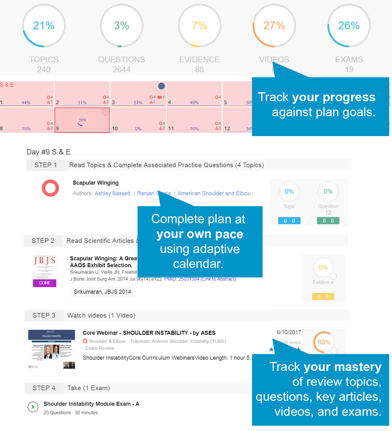 NOW WITH ADAPTIVE CALENDAR! 80 AMA PRA Category 1 CME Credits™ 20 ABOS Approved SAE Credits Designed to prepare surgeons forABOS Subspecialty in Sports Medicine Certification and Recertification Examination Click HERE to view ABOS Breakdown COMPLETE ALL 62-DAYS (LESSONS) AT YOUR OWN PACE A comprehensive 62-Day reading curriculum covering 238 essential sports topics and key scientific articles. 17 sports module exams and 2 sports only SAE exams to diagnose your weaknesses, reinforce your learning, and improve your testing performance. Integration with our new Peak Adaptive Learning Platform helps you learn more efficiently by tracking your progress and directing you to your areas of weakness. Plan comes with 12-month subscription to all the Premium Content & Adaptive Learning Technology of PEAK. STUDY PLAN SCHEDULE SPORTS MOC 62-DAY PLAN + SPORTS MOC 62-DAY PLAN + 12-MONTH PEAK SUBSCRIPTION 12-MONTH PEAK SUBSCRIPTION + NO CME 80 AMA PRA Category 1 Credits™ 20 ABOS-approved MOC SAE Credit $125 37% SUMMER DISCOUNT | NORMALLY $200 $274 16% SUMMER DISCOUNT | NORMALLY $480 NEW PERSONALIZED ADAPTIVE CALENDARPOWERED BY PEAK ADAPTIVE LEARNING Plan Details The 2018 SPORTS MOC 62-Day Study Plan is designed to prepare US Physicians for the 2018 ABOS Orthopaedic Sports Practice-Profiled Recertification Examination, which is administered in from September 27, 2018 through October 10, 2018. The Study Plan can also be taken by any surgeons who want to reinforce their Hand knowledge and stay up-to-date on current Hand literature. All of the daily study plans are available immediately starting the day you enroll. All of the daily study plans are posted in the Study Plan "classroom", allowing you to complete the Study Plan on your own schedule Access the Study Plan classroom by going to the Groups page and clicking the Study Plan logo The Sports MOC 62-Day Study Plan consists of three components: Daily Study Plans reviewing 264 Topics The 2018 MOC Sports 62-Day Study Plan delivers daily emails telling you exactly what topics to review and what questions to do We have carefully selected Sports topics covering Upper Extremities, Spine, and Lower Extremities to prepare you for the MOC Sports Clinical Exam Frequently-tested articles, often with a free full text PDF, are included in the daily study plans 17 Module Exams After each unit take Module Exams (25 questions) testing that material, reinforcing your knowledge 2 Mock Exams 2 Sports MOC Mock Exams CME Tracker Our CME Tracker will help you navigate the Study Plan, ensuring that you complete all the course requirements. PRICING & PURCHASE INFORMATION Study Plan + CME: $274 Gives you access to gives you access to the daily study plan, mock exams, and all premium content AND Total of 80 AMA PRA Category 1™ CME Credits CME Requirements: complete daily study plans complete 17 exams complete Post-Course CME Survey Including 20 ABOS approved MOC SAE Credits MOC SAE Requirements: Complete all 100 scored/recorded questions on each of two different Self-Assessment Exams (each worth 10 MOC SAE Credits) Study Plan Alone (No CME): $125 Gives you access to gives you access to the daily study plan, mock exams, and all premium content Payment Instructions Payment is made through PayPal and you automatically be redirected to your purchased product Orthobullets. Your login credentials on Paypal may be different than your login credentials on orthobullets be sure to log in with your usual orthobullets email after you made a purchase with any email on paypal. example, if you use your spouses (or other) Paypal account when you are redirected to orthobullets and asked to login in, log in with your usual orthobullets credentials (even though the email is different than Paypal. You can confirm if your purchase was registered on orthobullets by clicking "Purchased Products" in the user menu. If you have any problems email us at info@orthobullets with your Paypal transaction ID. SPORTS MOC 62-DAY PLAN + SPORTS MOC 62-DAY PLAN + 12-MONTH PEAK SUBSCRIPTION 12-MONTH PEAK SUBSCRIPTION + NO CME 80 AMA PRA Category 1 Credits™ 20 ABOS-approved MOC SAE Credit $12537% SUMMER DISCOUNT | NORMALLY $200 $27416% SUMMER DISCOUNT | NORMALLY $480 Q & A Q: If I lost some past daily Study Plan emails is there a way to get the old daily study plans? Answer: Yes. All past daily study plans can be found in the Study Plan private group. Scroll down to the "Comments" section where you will see the past daily study plans. Q: What if I am a member of the group but am still not getting daily emails in my inbox? Answer: Check your spam folder and promotions folder on your email. Because Orthobullets sends high volumes of email, our email is sometimes filtered into spam folders or promotions folders. Be sure to look there for our emails. If that is the case, mark us as "not spam" and add info@orthobullets.com to your contact list to avoid this in the future. If you are still not getting emails, send us a message at info@othobullets.com and we will figure it out. Q: How do I get to the Study Plan private group? Answer: Click groups in the top menu, then click on the logo for the group. Q: If I bought another Study Plan, can I get this one. Answer: Our Study Plans work on a 12-month premium content model. Thus, you have access to all of our Study Plans during your 12-month subscription. If you have purchased another Study Plan, and would like to be added to this one send us a message at info@orthobullets.com CME Information Orthobullets and the Foundation for Orthopaedic Research & Education (FORE) are pleased to partner and offer CME for the MOC Daily Study Plans.Units:A maximum of 80 AMA PRA Category 1 Credits™ Price:$274 with CME & SAE CME Course Requirements:1. Complete Daily Study Plans (spending on a total of 60 hours reading topic)2. Complete 16 module exams (spending on a total of 10 hours taking and reviewing mock exams)3.Watch 8 webinars (for a total time of 10 hours) SAE Course Requirements: