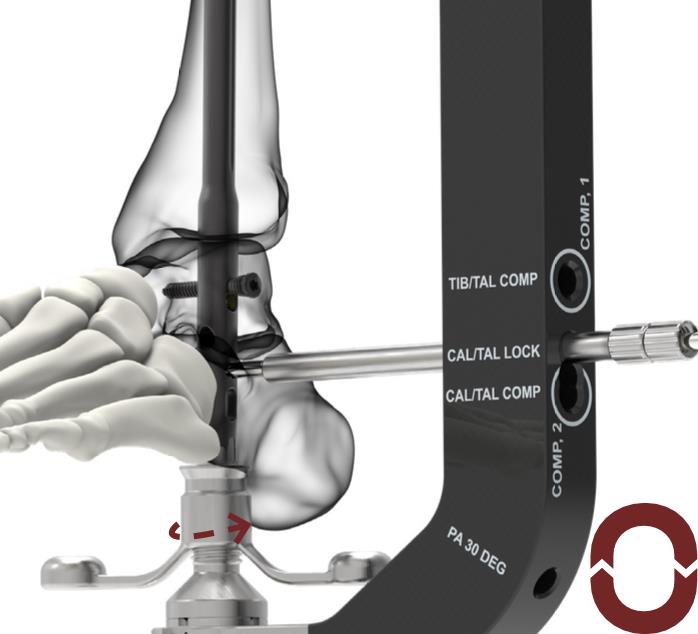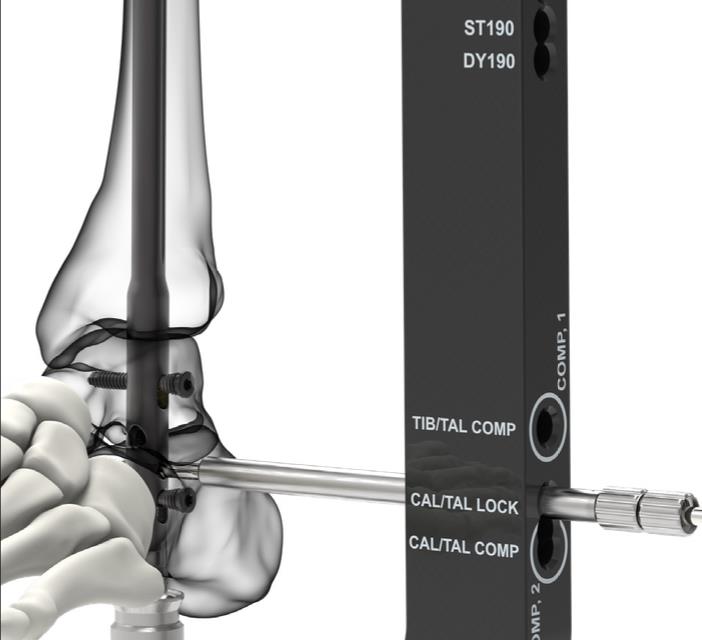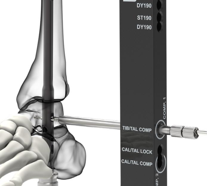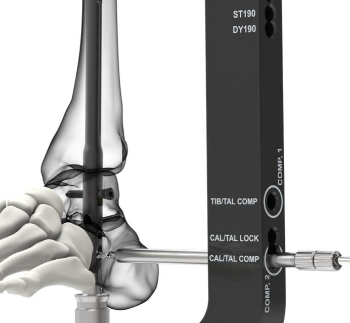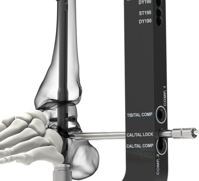 • Incorporates a staged compression mechanism (StageLock®) enabling controlled, internal, independent compression at the tibiotalar joint (Stage 1) and talocalcaneal joint (Stage 2), with up to 0-5mm of internal compression at each interface