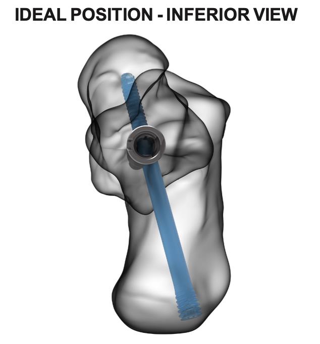 • ensure nail depth/position allows calcaneal screw holes to engage solid cancellous bone without breaching the plantar cortex of the subtalar joint