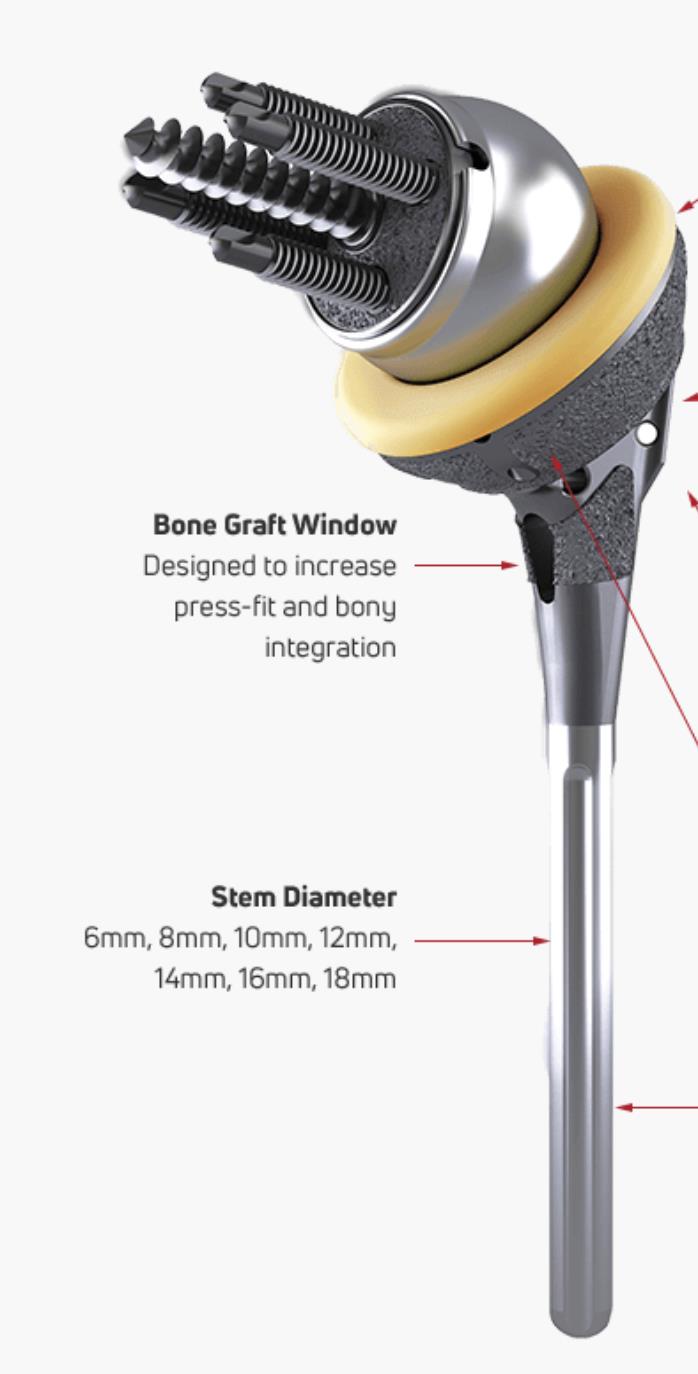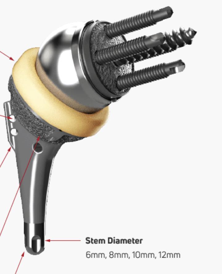Summary The AltiVate Reverse Shoulder System by Enovis is a reverse shoulder arthroplasty platform designed to restore mobility in patients with rotator cuff deficiency by optimizing implant fit and fixation. It uses a lateralized center of rotation and a 135° humeral neck-shaft angle to improve range of motion and reduce complications like scapular notching. The system incorporates modular components and precision instrumentation to better match patient anatomy and support stable long-term fixation. Indications Indications reverse total shoulder for patients with a functional deltoid muscle and a grossly deficient rotator cuff joint pain and dysfunction due to severe arthropathy with a grossly deficient rotator cuff previously failed joint replacement with a grossly deficient rotator cuff fracture of the glenohumeral joint from trauma or pathologic conditions including humeral head fracture, displaced 3- or 4-part fractures of the proximal humerus, or reconstruction after tumor resection bone defect in the proximal humerus anatomic total shoulder pain and dysfunction due to noninflammatory degenerative joint disease including osteoarthritis inflammatory arthritis of the glenohumeral joint including rheumatoid arthritis post-traumatic arthritis of the glenohumeral joint avascular necrosis of the humeral head with and without involvement of the glenoid the all-poly glenoid is intended for cemented use hemi shoulder pain and dysfunction due to noninflammatory degenerative joint disease including osteoarthritis inflammatory arthritis of the glenohumeral joint including rheumatoid arthritis post-traumatic arthritis of the glenohumeral joint avascular necrosis of the humeral head with and without involvement of the glenoid rotator cuff tear arthropathy Contraindications infection or sepsis insufficient bone quality which may affect the stability of the implant materials sensitivity non-functional deltoid muscle intraoperative conversion from a reverse to an anatomic shoulder Anatomy Osteology acromioclavicular joint is used as an incision landmark anatomic neck of the humerus is the stated osteotomy height and visualization target Muscles deltoid must be functional for reverse total shoulder indication is freed from the cephalic vein during the deltopectoral approach lateral undersurface is used as a distal axillary nerve palpation site is relaxed during glenoid exposure by arm positioning subscapularis lower subscapularis is a proximal axillary nerve palpation landmark remnant tendon is released from the lesser tuberosity and proximal humerus is retracted during glenoid exposure supraspinatus the humeral canal entry point is described at the greater tuberosity where the supraspinatus tendon normally would attach pectoralis major a portion of the tendon insertion is released during the approach long head of the biceps tendon should not be damaged during the approach is exposed and the rotator interval is opened to the superior rim of the glenoid conjoined tendon is identified during exposure Ligaments coracohumeral ligament is released from the lateral coracoid during glenoid exposure glenohumeral ligaments are released and excised from the glenoid during exposure capsule is released and excised from the glenoid, and the inferior capsule is excised for visualization labrum is released and excised from the glenoid Nerves interscalene nerve block is described as preferable before positioning musculocutaneous nerve traction injury is a specific risk if medial retractors are used on the conjoined tendon axillary nerve is palpated proximally between the conjoined tendon and the lower subscapularis muscle is palpated distally on the undersurface of the lateral deltoid muscle is confirmed with the tug test is at risk near posterior-inferior capsular resection is re-examined with the tug test after final reduction brachial plexus traction injuries are specifically noted as a risk during anterior retraction around the glenoid Blood supply cephalic vein is identified and preserved during the deltopectoral approach anterior humeral circumflex vessels are ligated at the lower portion of the subscapularis Approach Patient preparation and positioning general endotracheal anesthesia combined with an interscalene nerve block is described as preferable prior to positioning the patient is placed in an upright beach chair position with the head firmly secured and the arm draped free the operative arm must be sufficiently off to the side of the bed to allow unobstructed movement in adduction and hyperextension Exposure an extended deltopectoral approach is used the subdeltoid, subacromial, and subcoracoid spaces are exposed, the subacromial bursa is excised, the coracoid tip and conjoined tendon are identified, and the clavipectoral fascia is incised on the lateral border of the conjoined tendon Technical specifications Humeral stems Shell type Short length 48mm Standard length 108mm Revision length 175mm and 220mm Standard shell (diameter) 6mm, 8mm, 10mm, 12mm, 14mm, 16mm, and 18mm 6mm, 8mm, 10mm, 12mm, 14mm, 16mm, and 18mm 175mm: 6mm, 8mm, 10mm, 12mm, 14mm, and 16mm 220mm: 6mm, 8mm, and 10mm Small shell (diameter) 6mm, 8mm, 10mm, and 12mm 6mm, 8mm, 10mm, and 12mm 175mm: 6mm, 8mm, 10mm, and 12mm 220mm: 6mm, 8mm, and 10mm Reverse glenoid construct 5.0 mm locking peripheral screws are listed in lengths of 14, 18, 22, 26, 30, 34, and 38 mm 3.5 mm nonlocking peripheral screws are listed in lengths of 14 to 38 mm in 2 mm increments Reverse glenoid heads and socket inserts 32, 36, 40, and 44 mm reverse glenoid head options all glenoid heads are described as having a 5.4 mm central hole for a 16 mm retaining screw socket inserts are listed for standard shell and small shell constructs in 32, 36, 40, and 44 mm diameters insert thickness options are standard and +4 constraint options are standard and semi-constrained standard poly and E+ poly inserts are listed Spacers, instruments, and preparation sizes spacer options
