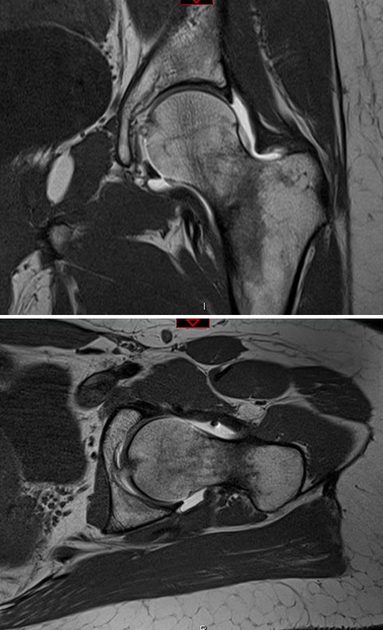 summary A Femoral Neck Stress Fracture (FNSF) is caused by repetitive loading of the femoral neck that leads to either compression side (inferior-medial neck) or tension side (superior-lateral neck) stress fractures. Diagnosis can be be made with radiographs but findings often lag behind often resulting in negative radiographs early on. MRI is the diagnostic study of choice in the presence of normal radiographs. Nonoperative treatment is indicated for compression sided fractures with < 50% femoral neck width. Cannulated screw fixation is indicated for tension sided stress fractures or compression sided fractures with > 50% width or hip effusion. Epidemiology Incidence 0.04% of military personnel 20 per 10,000 recruits per year 3-5% of sports-related stress fractures 9% of lower extremity stress fractures Demographics age range 16-56 years of age male: female ratio female > male race most commonly caucasian Risk factors demographic female caucasian older age activity-related military personnel track and field or cross-country athlete high training volume and intensity medical lower BMI decreased bone mineral density energy deficiency (energy expenditure > caloric intake) tobacco use anatomical femoroacetabular impingement (FAI) coxa vara abnormal running gait pattern Etiology Pathophysiology mechanism repetitive loading of femoral neck exceeds elastic properties of bone causing microscopic fracture continuous microscopic fractures exceed osteoblastic activity resulting in stress fracture Genetics 3x higher risk with absent gene calcitonin receptor C allele vitamin D recepter C-A haplotype Associated conditions "female athlete triad" amenorrhea, eating disorder, and osteoporosis must be considered in any female athlete with stress fracture 2-4x increased risk hormonal dysregulation of hypothalamic-pituitary-gonadal (HPG) axis decrease in estrogen levels which is necessary for osteoblast maturation increased osteoclast activity relative to osteoblast activity oral-contraceptives use increases bone mineral density FAI associated with 50% of FNF stress fractures 42% CAM lesion 78% pincer lesion Anatomy Osteology neck-shaft angle 130 +/- 7 deg anteversion 10 +/- 7 deg calcar region strongest part of femoral neck with dense bone along posteromedial neck Ligaments hip capsule reinforced by 3 ligaments iliofemoral ligament composed of lateral (superior) and medial (inferior) fibrous branches insert onto AIIS and extends out to IT line forming Y-shaped ligament of Bigelow reinforce capsule during ER and extension ischiofemoral ligament inserts on ischium posteroinferior to acetabular rim and attaches to posterior IT line reinforce capsule during IR in neutral and flexion-adduction positions pubofemoral ligament inserts on superior pubic ramus and insert onto femur (with medial iliofemoral and inferior ischiofemoral ligaments) reinforcing inferior capsule to restrict excessive abduction and ER during hip extension Muscles hip extensors induce highest tensile strain in proximal-posterior neck cortex and compressive strain in anterior neck primary hip extensors gluteus maximus hamstring muscles semitendinosus semimembranosus bicep femoris long head biceps femoris short head knee extensors lowest potential to load femoral neck due to low hip reaction force generated by rectus rectus femoris only hip-spanning muscle of knee extensor muscle group hip flexors highest compressive strain in proximal-posterior neck cortex and tensile strain in anterior neck primary hip flexors iliopsoas sartorius rectus femoris hip abductors induced highest compressive strain in distal and superolateral neck primary abductors gluteus medius gluteus minimus tensor fascia lata Blood supply of femoral head provided by three main branches medial femoral circumflex artery predominant blood supply to femoral head lateral femoral circumflex artery artery of ligamentum teres small contribution (~10%) greater displacement of fracture leads to greater risk of disruption of vascular supply Biomechanics 3-5x body weight across femoral neck with jogging 8.4x body weight with running compression-sided fractures compressive forces occur primarily along inferior femoral neck near calcar region microfracture propagates at 45 deg of applied forces leading to more stable oblique pattern tension-sided fractures bending forces along superolateral neck are stabilized by abductor forces adbuctors fatigue and fracture propagates at 90 deg of cortex unstable transverse pattern CLASSIFICATION Femoral Neck Stress Fracture Classifications Fullerton-Snowdy Shin Rohen-Quinquilla Steele Modality Radiographs and Bone scan Radiographs and MRI MRI Radiographs and MRI Categories Compression-sided Compression-sided edema + no fracture Fracture line <50% Fracture line > 50% Low grade I : Endosteal edema ≤ 6 mm Low grade II: Endosteal edema >6 mm + no fracture Compression-sided edema no fracture Fracture <50% without hip effusion Fracture <50% with hip effusion Fracture >50% with hip effusion Tension-sided Tension-sided High grade III: fracture <50% neck width High grade IV: fracture >50% neck width Tension-sided Displaced Displaced Displaced Presentation History history of overuse running activities recent increase in training high impact activities Symptoms insidious onset of thigh or groin pain may radiate to knee pain increases with repetitive weight-bearing activities pain improves with cessation of activity completion of fracture may be associated with cracking or popping and inability to bear weight Physical exam palpation tenderness directly over groin region (62%) motion pain with extremes of hip motion (79%) antalgic gait provocative tests pain with straight leg raise, log roll, or axial load Imaging Radiographs recommended views AP pelvis AP hip cross-table lateral of hip findings early findings usually normal 90% of initial radiographs normal 50% of repeat radiographs at 4-6 weeks late findings may take 6-8 weeks to see radiographic changes "grey 