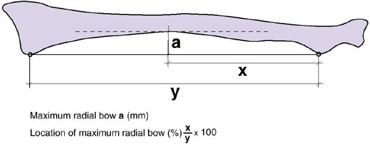This patient sustained a both-bone forearm fracture that was fixed with a long, straight plate which did not account for the native radial bow. This is the most likely reason for his limited pronosupination.Open reduction with internal fixation of both-bone forearm fractures has generally demonstrated a high rate of union and excellent functional results. However, restoration of the radial bow is a critical. A lack of radial bow will limit pronosupination. To avoid this problem, the surgeon could have used a shorter plate or a plate with an anatomic radial bow, which many modern forearm plating systems now account for. The assessment and calculation for radial bow is highlighted in Illustration A. Other factors which may contribute to limited pronosupination include heterotopic ossification and scarring, though the former is not seen on radiographs.Matthews et al. evaluated the impact of radial bow on pronosupination in a cadaveric both-bone forearm fracture model. The authors found that with a 10-degree deviation from the anatomic radial contour, there was no loss of pronosupination. However when this was increased to a 20-degree angulation, there was a significant loss of forearm pronosupination. The authors underscored the importance of restoration of radial bow in fixation of both-bone forearm fractures.Schemitsch and Richards evaluated the outcomes in 55 adult patients following both-bone forearm fracture fixation. They reported good-excellent outcomes in 84% of cases. The authors found that bone grafting did not affect union (54/55 achieved union), but noted that restoration of the radial bow affected functional outcome and grip strength. The authors stressed the importance of restoration of radial bow. Figure A is an AP radiograph of the forearm following ORIF of a both-bone forearm fracture with a long straight plate which fails to restore the anatomic radial bow. Figure B is a lateral radiograph of the same patient demonstrating fracture fixation with a long straight plate. Illustration A demonstrates the method for determining radial bow. A line from the sigmoid notch to the bicipital tuberosity is drawn (Y). A perpendicular line is drawn from Y to the point on the radial with maximal bow (a) (This number is usually 7%). The point of this intersection to the bicipital tuberosity is marked (x). The location of maximal bow is x/y (This number is usually 60%).Incorrect Answers:Answer 1: The patient is non-tender and has returned to activities. He does not have any clinical or radiographic evidence of fracture nonunion.Answer 2: The patient has full active range of motion of his digits and wrist, which would indicate that the PIN is functional.Answer 3: The ECU can be interposed at the DRUJ, particularly in radial shaft fractures in which the DRUJ is unstable after fracture fixation. However, this patient does not have DRUJ instability. Furthermore, there is no evidence of DRUJ diastasis on X-Ray.Answer 4: The radiographs are negative for any evidence of heterotopic ossification, though this is another potential source of limited motion following ORIF of both-bone forearm fractures.