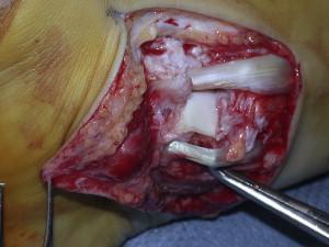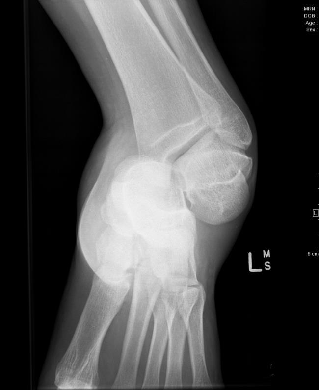 This patient has a lateral subtalar joint dislocation. The posterior tibialis tendon is the most common structure preventing successful closed reduction.Subtalar dislocations are hindfoot dislocations that result from high-energy trauma. The diagnosis is made clinically and confirmed with orthogonal radiographs of the foot. A lateral subtalar dislocation has been associated with fractures of the cuboid, anterior calcaneus, lateral process of talus, and the fibula. Treatment is a trial of closed reduction but may require open reduction given the several anatomic blocks to reduction. Blocks to a successful closed reduction of the lateral subtalar dislocation include medial-sided structures such as the posterior tibialis tendon (most common), flexor hallucis longus, and flexor digitorum longus.Jungbluth et al. reviewed the functional and subjective results of a cohort of patients with subtalar dislocations. They reported no difference between the results of the medial and lateral subtalar dislocations. They concluded that the intermediate-term results for a subtalar dislocation without an associated osseous injury are good, and the direction of the dislocation does not appear to make a difference with regard to clinical or radiographic outcome.Veltman et al. reviewed lateral subtalar dislocation. They reported that known complications following these injuries include avascular necrosis of the talus, infection, posttraumatic osteoarthritis requiring arthrodesis and chronic subtalar instability. They noted that negative prognostic factors include lateral and complicated dislocations, total talar extrusions, and associated fractures. They concluded that in cases of uncomplicated lateral subtalar joint dislocation, excellent functional outcomes after closed reduction and immobilization can be expected. Illustration A shows a posterior tibialis tendon preventing successful reduction of a lateral subtalar joint dislocation. Illustration B is the radiograph of the ankle demonstrating a medial subtalar dislocation. Incorrect Answers:Answer 1: The CFL is a laterally based structure and is very unlikely to impede closed reduction of a lateral subtalar joint dislocationAnswers 2,3,5: Extensor digitorum brevis, peroneal tendons, and the talonavicular joint capsule are common blocks to the closed reduction of a MEDIAL subtalar joint dislocation