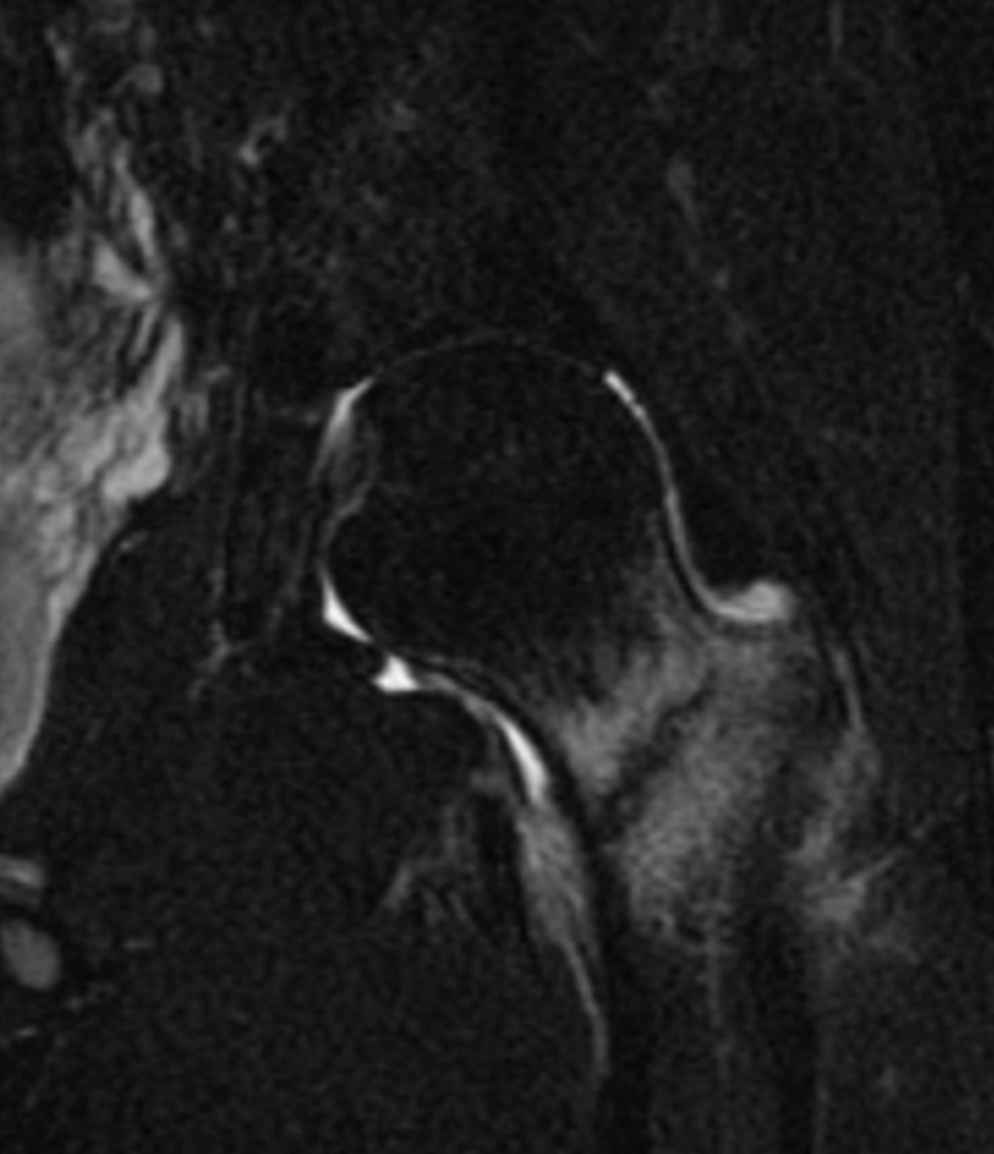 This young female patient has symptoms and radiographic findings consistent with a compression-sided femoral neck stress fracture. The next best step is an urgent MRI to determine the extent of femoral neck involvement (Answer 4).Femoral neck stress fractures are fractures of the femoral neck that occur secondary to repetitive loading. These injuries come in two patterns, compression side (inferior-medial neck) or tension side (superior-lateral neck). Repetitive loading causes microscopic fractures which propagate due to continued repetitive loading and/or poor capacity for healing. They are common in runners and are classically associated with the female athlete triad of amenorrhea, disordered eating, and osteoporosis. Treatment is dependent on fracture pattern (compression vs. tension) and the extent of femoral neck involvement. The study of choice for determining the pattern and extent of neck involvement is MRI.Neubauer et al. provide a systematic review of the literature on femoral neck stress fractures in runners. Their study included 48 runners. The authors conclude that patients with a history of prior stress fracture and/or relevant comorbidity (i.e. female athlete triad) had a shorter diagnostic time for evaluation.Behrens et al. provide a review of the literature on stress fractures of the pelvis and legs in athletes. They note that fractures in locations subjected to tension (supero-lateral femoral neck, anterior tibia, patella, etc.) are at a high risk of progression, and oftentimes require surgery. The authors conclude that MRI is the diagnostic modality of choice.Robertson and Wood provide a comprehensive review of femoral neck stress fractures in athletes. They note that while small compression-sided femoral neck stress fractures are at low risk of progression, those with greater than 50% involvement of the femoral neck have a high risk of progression and oftentimes require surgical intervention. They conclude that MRI is the study of choice to determine the pattern and extent of neck involvement.Figure A is an AP radiograph of a left hip demonstrating a sclerotic line along the inferior aspect of the base of the femoral neck, suggestive of a compression-sided femoral neck stress fracture. Illustration A is a T2-weighted MRI of the same patient, demonstrating a fracture line that spans greater than 50% of the femoral neck.Incorrect Answers:Answer 1: The patient's symptoms are more consistent with a stress fracture. A patient with infectious arthritis would not likely present with a benign physical examination, or radiographs with a sclerotic focus along the femoral neck.Answer 2: This would be the correct next step for a tension-sided femoral neck stress fracture, or a compression-sided fracture which spans more than 50% of the femoral neck. This patient's radiographs are consistent with a compression-sided fracture, and MRI is necessary to determine the size of the fracture line.Answer 3: The patient has radiographic findings consistent with a femoral neck stress fracture. MRI must be performed to determine pattern and size prior to allowing for protected weight-bearing,Answer 5: The patient has radiographic findings consistent with a femoral neck stress fracture. Immediate return to sport carries a high risk of causing fracture propagation.