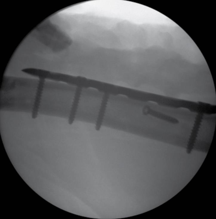 • Repeat this step on the opposite side of the fracture to compress the plate to the bone.