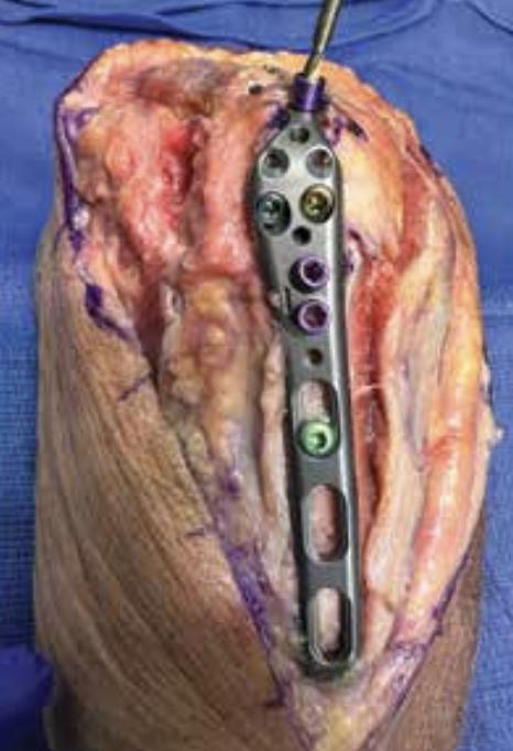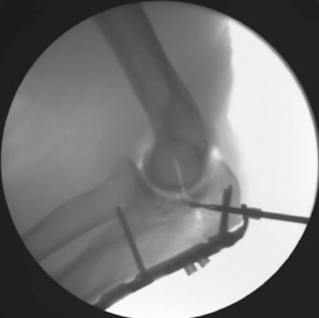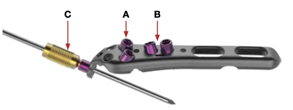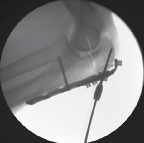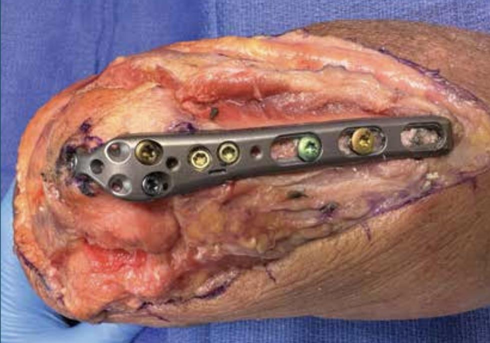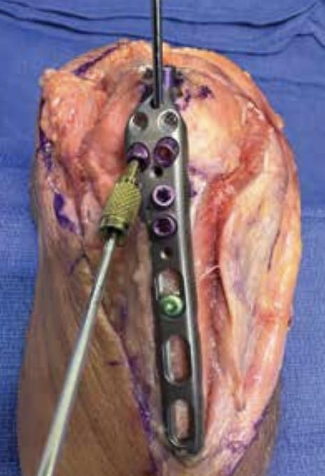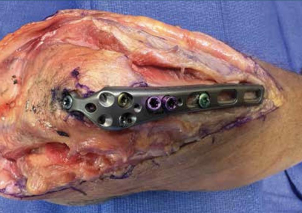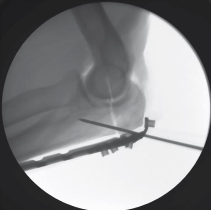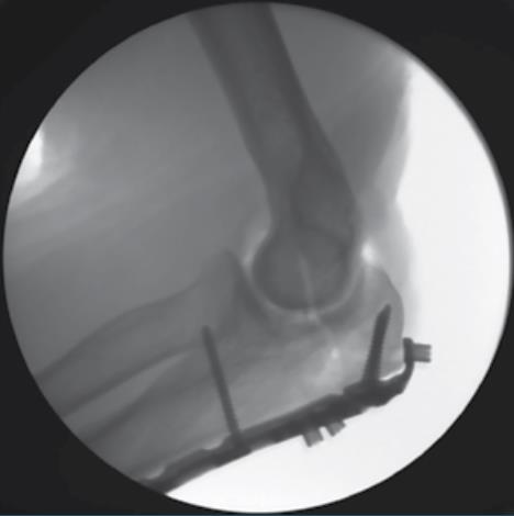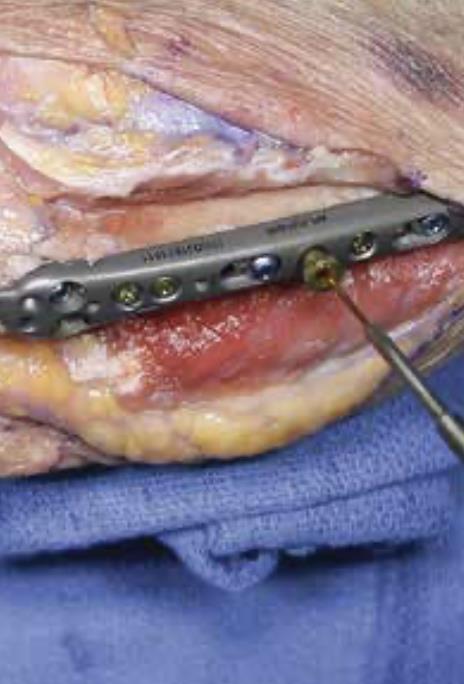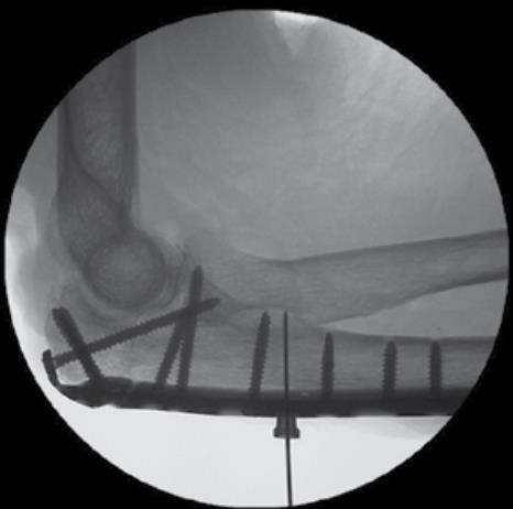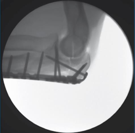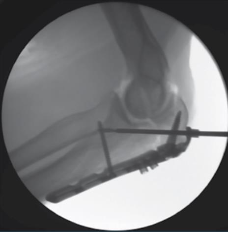 Summary The Skeletal Dynamics Distal Elbow Plating System consists of the following systems: Proximal Ulna Plate with FREEFIX® (this page) ALIGN® Radial Head System IJS® Elbow Stabilization System The Skeletal Dynamics Distal Elbow Plating System contains titanium alloy plates and screws Included in the set are cobalt chrome cannulated polyaxial locking screws, k-wires, and specialized instrumentation Indications Ulna fractures Fusions Osteotomies Non-unions Anatomy Osteology proximal ulna olecranon process coronoid tip trochlear notch ulnar shaft Muscles triceps anconeus flexor-pronator mass extensor-supinator mass brachialis Ligaments UCL (medial) LCL complex LUCL posterior capsule annular ligament Nerves ulna nerve medial nerve radial nerve posterior interosseous nerve Blood supply ulnar artery posterior ulnar recurrent interosseous vessels radial recurrent Preoperative Planning Imaging x-ray standard imaging includes AP and true lateral radiographs of the elbow oblique views and a forearm series to evaluate for associated diaphyseal or radial head injuries CT useful in complex intra-articular fractures allows detailed assessment of coronoid fragments, trochlear notch morphology, and radial head involvement Approach Posterior midline incision Technique Superficial Exposure with the elbow flexed to approximately 90 degrees, a posterior midline skin incision is made, curving gently around the olecranon tip and extending distally along the subcutaneous border of the ulna note: the incision can be curved slightly lateral or medial to the tip of the olecranon based on your preferred method warning: take care to avoid injury to the ulnar nerve Releasing the Ulnar Nerve locate the ulnar nerve release and protect the nerve, considering the possibility of transposition Deep Exposure expose the proximal ulna sub-periosteally Accessing the Joint for olecranon fractures, enter the joint through the fracture plane by releasing the capsular attachments on the proximal fragment as needed the articular surfaces can be evaluated at this time Debriding the Fracture debride the fracture site note: it is necessary to remove callus, clot and fibrous tissue in order to achieve a proper reduction Distal Triceps Release starting distal to proximal, split the triceps insertion longitudinally for approximately 1cm elevate the triceps along a narrow longitudinal strip to provide space for the “Home Run” (HR) tab Plate Selection select the appropriate length of plate that provides at least six cortices of fixation distal to the fracture line note: the shaft of the 5 Slot Plus plate can be bent using the Bending Irons if plate bending is necessary, refer to bending step warning: bending may weaken or break the plate be sure to inspect the plate for damage prior to use. Provisional Plate Fixation apply the plate to the proximal fragment confirming that the plate is centered on the ulna shaft and that the HR tab is flush to the olecranon secure the plate to the proximal fragment using a 2mm K-Wire through the hole at the base of the HR tab note: if the home run tab adjustment is necessary to improve fit, refer to adjustment step Fracture Reduction reduce the fracture by levering the shaft of the plate to the distal fragment confirm fracture reduction and plate alignment using fluoroscopy Distal Fragment Fixation using the 2.7mm x 40mm drill bit, drill through the distal end of a FreeFix slot that is distal to the fracture line through both cortices this will allow for dynamic compression of the fracture measure screw length using the appropriate scale on the 50mm Depth Gauge, then insert a 3.5mm compression screw using the T-10 Driver while applying interfragmentary compression note: the depth gauge has a dual scale to reflect measurements through the PDGs (top scale) or directly through the plate (bottom scale) Proximal Fixation Options A the two proximal holes containing Pre Assembled Drill Guidesare for fixation to the olecranon B the adjacent two distal holes containing PDGs are for fixation to the coronoid C all PDGs can accept an AIMing Guide using 2.0mm K-Wires for provisional fixation if it is necessary to alter a screw trajectory, remove the PDG and drill free-hand a tissue protector is included in the system if a 3.0mm Cannulated Polyaxial Locking Screw (PLS) is needed, refer to steps 'Cannulated 3.0 PLS SETUP' through 'Cannulated 3.0 PLS Fixation' Provisional K-wire Fixation if provisional plate fixation is needed, insert a 2.0mm AIMing Guide into the desired PDG, then drive a 2.0mm k-wire through the AIMing Guide, taking care to avoid the articular surfaces of the joint using the 2.7mm drill bit, drill through the PDG if a K-Wires obstructs drilling, it may be bent out of the way Olecranon Fixation measure the screw length using the appropriate scale on the 50mm Depth Gauge using the T-10 Driver, remove the PDG and insert the correct length 3.5mm Multi-Thread Compression Screw until the screw head contacts the plate remove the K-Wires at the base of the HR tab, then fully seat the Compression Screw until the plate is reduced to the olecranon note: it is recommended to subtract ~2mm from the measured screw lengths to avoid compromising the articular surfaces and/or soft tissue irritation Fluoroscopic Confirmation repeat steps past two steps for the remaining olecranon screw hole using a 3.5mm Multi-Thread Locking Screw confirm proper plate positioning, fracture reduction and screw lengths using fluoroscopic imaging Preparing the Home Run Tab confirm that the HR tab is flush to the tip of the olecranon using the 2.7mm x 80mm drill bit, drill through the PDG, then measure and record the screw length using the appropriate scale on the 80mm Depth Gauge note: if the HR tab was bent, confirm that the new trajectory will avoid contact with the articular surfaces of the joint warning: bending may weaken or break the plate be sure to inspect the tab for damage prior to use Over Drilling the Home Run Tab us