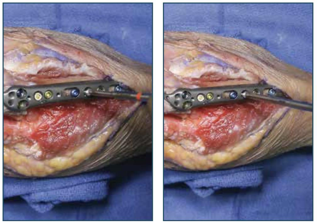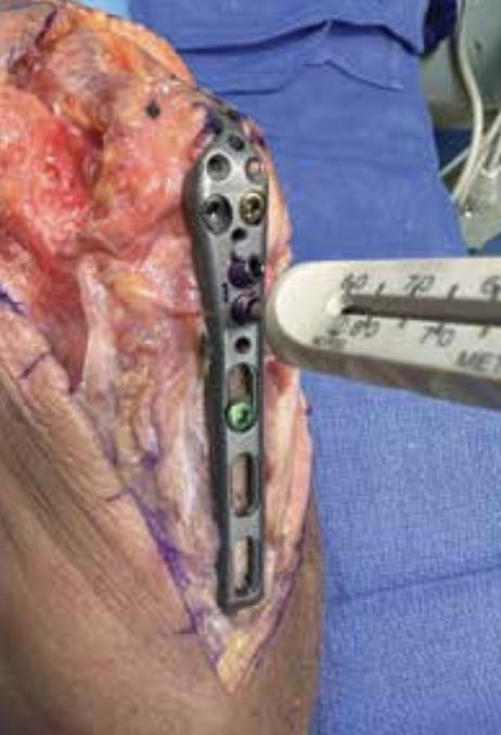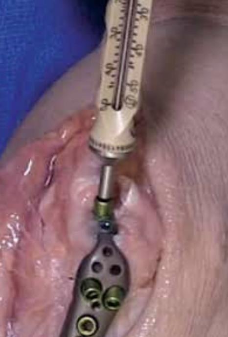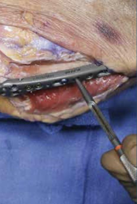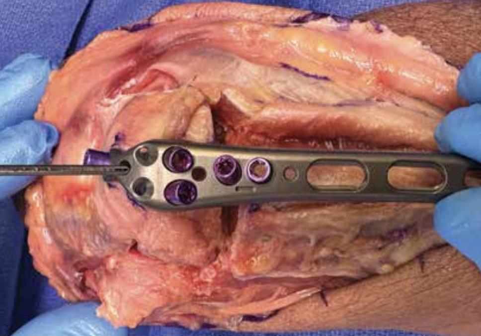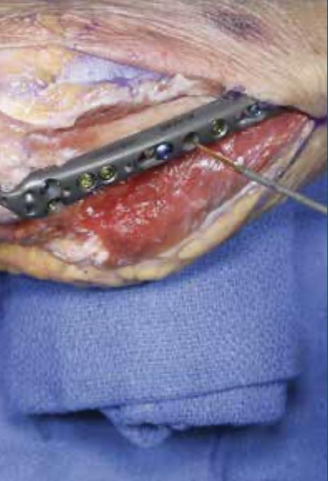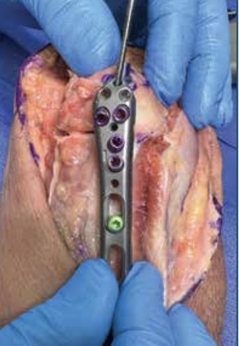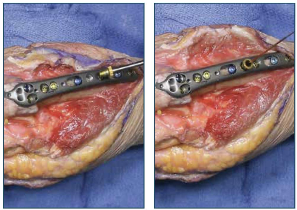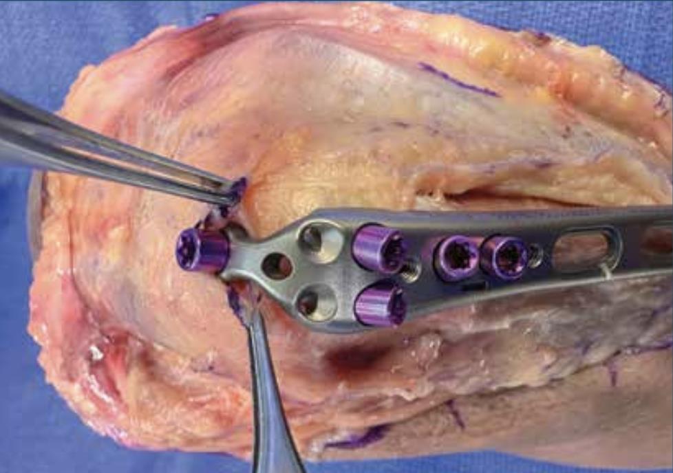 Summary The Skeletal Dynamics Distal Elbow Plating System consists of the following systems: Proximal Ulna Plate with FREEFIX® (this page) ALIGN® Radial Head System IJS® Elbow Stabilization System The Skeletal Dynamics Distal Elbow Plating System contains titanium alloy plates and screws Included in the set are cobalt chrome cannulated polyaxial locking screws, k-wires, and specialized instrumentation Indications Ulna fractures Fusions Osteotomies Non-unions Anatomy Osteology proximal ulna olecranon process coronoid tip trochlear notch ulnar shaft Muscles triceps anconeus flexor-pronator mass extensor-supinator mass brachialis Ligaments UCL (medial) LCL complex LUCL posterior capsule annular ligament Nerves ulna nerve medial nerve radial nerve posterior interosseous nerve Blood supply ulnar artery posterior ulnar recurrent interosseous vessels radial recurrent Preoperative Planning Imaging x-ray standard imaging includes AP and true lateral radiographs of the elbow oblique views and a forearm series to evaluate for associated diaphyseal or radial head injuries CT useful in complex intra-articular fractures allows detailed assessment of coronoid fragments, trochlear notch morphology, and radial head involvement Approach Posterior midline incision Technique Superficial Exposure with the elbow flexed to approximately 90 degrees, a posterior midline skin incision is made, curving gently around the olecranon tip and extending distally along the subcutaneous border of the ulna note: the incision can be curved slightly lateral or medial to the tip of the olecranon based on your preferred method warning: take care to avoid injury to the ulnar nerve Releasing the Ulnar Nerve locate the ulnar nerve release and protect the nerve, considering the possibility of transposition Deep Exposure expose the proximal ulna sub-periosteally Accessing the Joint for olecranon fractures, enter the joint through the fracture plane by releasing the capsular attachments on the proximal fragment as needed the articular surfaces can be evaluated at this time Debriding the Fracture debride the fracture site note: it is necessary to remove callus, clot and fibrous tissue in order to achieve a proper reduction Distal Triceps Release starting distal to proximal, split the triceps insertion longitudinally for approximately 1cm elevate the triceps along a narrow longitudinal strip to provide space for the “Home Run” (HR) tab Plate Selection select the appropriate length of plate that provides at least six cortices of fixation distal to the fracture line note: the shaft of the 5 Slot Plus plate can be bent using the Bending Irons if plate bending is necessary, refer to bending step warning: bending may weaken or break the plate be sure to inspect the plate for damage prior to use. Provisional Plate Fixation apply the plate to the proximal fragment confirming that the plate is centered on the ulna shaft and that the HR tab is flush to the olecranon secure the plate to the proximal fragment using a 2mm K-Wire through the hole at the base of the HR tab note: if the home run tab adjustment is necessary to improve fit, refer to adjustment step Fracture Reduction reduce the fracture by levering the shaft of the plate to the distal fragment confirm fracture reduction and plate alignment using fluoroscopy Distal Fragment Fixation using the 2.7mm x 40mm drill bit, drill through the distal end of a FreeFix slot that is distal to the fracture line through both cortices this will allow for dynamic compression of the fracture measure screw length using the appropriate scale on the 50mm Depth Gauge, then insert a 3.5mm compression screw using the T-10 Driver while applying interfragmentary compression note: the depth gauge has a dual scale to reflect measurements through the PDGs (top scale) or directly through the plate (bottom scale) Proximal Fixation Options A the two proximal holes containing Pre Assembled Drill Guidesare for fixation to the olecranon B the adjacent two distal holes containing PDGs are for fixation to the coronoid C all PDGs can accept an AIMing Guide using 2.0mm K-Wires for provisional fixation if it is necessary to alter a screw trajectory, remove the PDG and drill free-hand a tissue protector is included in the system if a 3.0mm Cannulated Polyaxial Locking Screw (PLS) is needed, refer to steps 'Cannulated 3.0 PLS SETUP' through 'Cannulated 3.0 PLS Fixation' Provisional K-wire Fixation if provisional plate fixation is needed, insert a 2.0mm AIMing Guide into the desired PDG, then drive a 2.0mm k-wire through the AIMing Guide, taking care to avoid the articular surfaces of the joint using the 2.7mm drill bit, drill through the PDG if a K-Wires obstructs drilling, it may be bent out of the way Olecranon Fixation measure the screw length using the appropriate scale on the 50mm Depth Gauge using the T-10 Driver, remove the PDG and insert the correct length 3.5mm Multi-Thread Compression Screw until the screw head contacts the plate remove the K-Wires at the base of the HR tab, then fully seat the Compression Screw until the plate is reduced to the olecranon note: it is recommended to subtract ~2mm from the measured screw lengths to avoid compromising the articular surfaces and/or soft tissue irritation Fluoroscopic Confirmation repeat steps past two steps for the remaining olecranon screw hole using a 3.5mm Multi-Thread Locking Screw confirm proper plate positioning, fracture reduction and screw lengths using fluoroscopic imaging Preparing the Home Run Tab confirm that the HR tab is flush to the tip of the olecranon using the 2.7mm x 80mm drill bit, drill through the PDG, then measure and record the screw length using the appropriate scale on the 80mm Depth Gauge note: if the HR tab was bent, confirm that the new trajectory will avoid contact with the articular surfaces of the joint warning: bending may weaken or break the plate be sure to inspect the tab for damage prior to use Over Drilling the Home Run Tab us