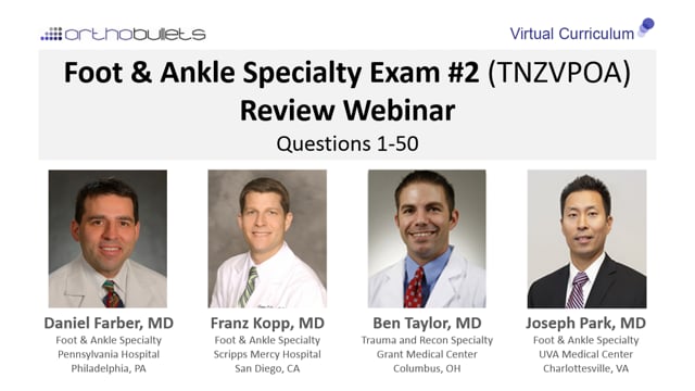 This webinar reviews the 50 questions that appeared on the Foot & Ankle #2 Specialty Exam (TNZVPOA). Click link below to take the exam if you have not yet done so:http://www.orthobullets.com/post/view?id=1312Some Helpful Tips:1. Please post any "chat" questions in the Comments window below. Our faculty will answer your questions ASAP. 2. For better video resolution click expand screen on the bottom right of the video.3. Questions are ordered in a standard review order which is different than the order by which you took the exam.4. You can view the questions in a separate window by clicking the OBQ link in the column on the left.5. You can go directly to the video chapter or question by clicking the "time stamp" link in the column on the right.Please send us an email at info@orthobullets.com to give us your opinion on this video format.
