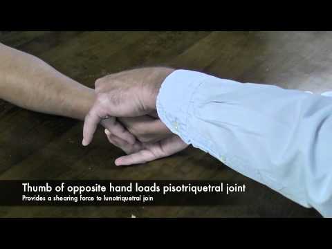 The patients elbow is flexed and in neutral rotation. The examiner grasps the patients wrist, placing their thumb on the patient's lunate. The thumb of the opposite hand loads the pisotriquetral joint. A positive test will result in pain, crepitus or instability.