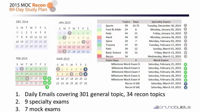 This is a 14 minute video that describes how to navigate the 2015 MOC Recon 89-Day Study Plan. The video explains how to:1. Read topics from the daily email2. Read articles from the daily email3. Take exams from the daily email4. Review the exams from prior exams5. Track CME requirementsThe video describes the steps, then provides a website demonstration.Sincerely,The Orthobullets Team