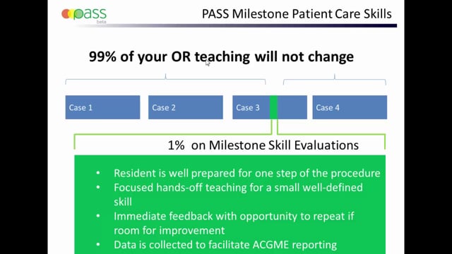 Video Lentgth: 5 MinutesMilestone Skill Evaluations (MSEs) - Putting Residents in the Surgical Driver's Seat1. Residents need to demonstrate ~ 120 skills per year, or 2-3 skill per week.2. Milestone Skill Evaluations represent a very small % of OR teaching - 99% of the time will not change.3. Milestone Skill evaluations should be an opportunity to take a time out from the normal hustle of residency and focus on high-quality learning/teaching for a small part of the procedure in which the resident is well prepared.RULES OF THE ROAD1. Residents should not be evaluated on more than one skill per procedure. (this is about quality, not quantity)2. Residents should not complete more than 2 skills per day. 3. Residents should requst the skill evaluation to the faculty the day before the case. The resident should remind the faculty at the beginning of the case which skill he wants to be evaluated on.4. Faculty should grade the evaluation by the end of the day. It should take less than 15 seconds on their mobile phone. POOR GRADES ARE AN OPPORTUNITY TO LEARNIf a resident does not do the procedure competently and independently than he should receive a poor grade.Poor grades should be viewed as a good thing - an opportunity to be better.If given a poor grade, the resident repeats the procedure the next time. Once given a passing grade, the poor grade is deleted from the record permanently. NOBODY can ever see it again.