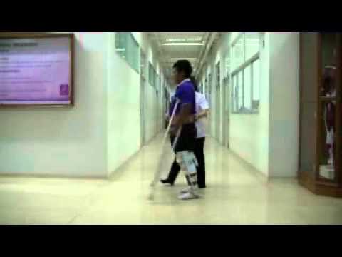 Video demonstrates a swing-to gait pattern of ambulation with an assistive device