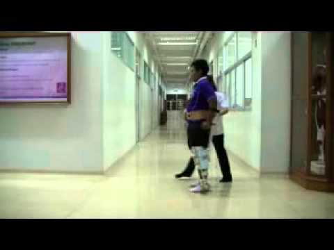 Video demonstrates a swing-through gait pattern of ambulation with an assistive device