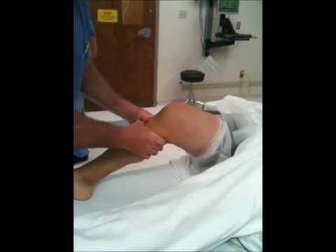 Positive posterior drawer test in a patient who sustained a PCL tear. The examiner displays posterior translation of the tibia on the femoral condyles when posterior force is applied to the knee in 90 degrees of flexion.
