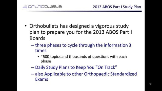 This video gives an introduction to the 2013 ABOS Part I Study Plan.If you are a U.S resident taking ABOS Part I on July 11th, 2013, it is time to start studying!Orthobullets has created 189-day study plan for the ABOS Part I. The course will consist of 3 phases. Each phase will review ~500 "testable" topics and related questions, so an individual will see all "testable material" 3 times over the duration of the course.Phase 1 will last 85 days and you will review 6 topics per day and an average of 36 questions a day. Phase 2 will last 60 days and you will review 8 topics per day and an average of 42 questions a day. Phase 3 will last 44 days and you will review 11 topics per day and an average of 66 questions a day.The course will be structured around a Daily Study Plan, which will be posted to this group every morning and provide links to the topics and abstracts that should be reviewed that day. In order to register for free, just click "Join Group" at the following link.http://www.orthobullets.com/group/home?id=858NOTICE:While we love compliments, please post them on the feedback page and do not post them under our topics, questions, or videos.On orthobullets we want all comments to be educational in nature for the benefit of our learning community. Therefore, if you want to rate our content, please use the five-star rating system instead of posting a compliment. Critical feedback that helps improve the site is welcomed and encouraged.