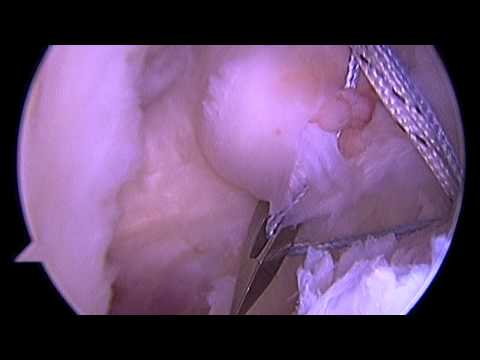 Surgical demonstration of an arthroscopic subscapularis repair.