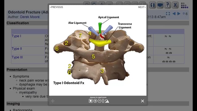 This is a review video highlighting the important aspects of the evaluation and treatment of odontoid fractures. It is directed at those preparing for ABOS Part I and the ABOS Maintenance of Certification Exam.This lecture is the first of a series of review lectures that will be posted on orthobullets over the coming months. In addition it will be available for download as a podcast.Please give us any feedback on whether you think it was a useful review.ENLARGE SCREEN:Be sure to use the function (four small arrow) in bottom right corner that allows you to enlarge the video to full screen size.