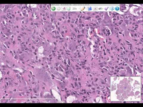Demonstrates a pathologist analyzing the histopathology of a chondroblastoma.