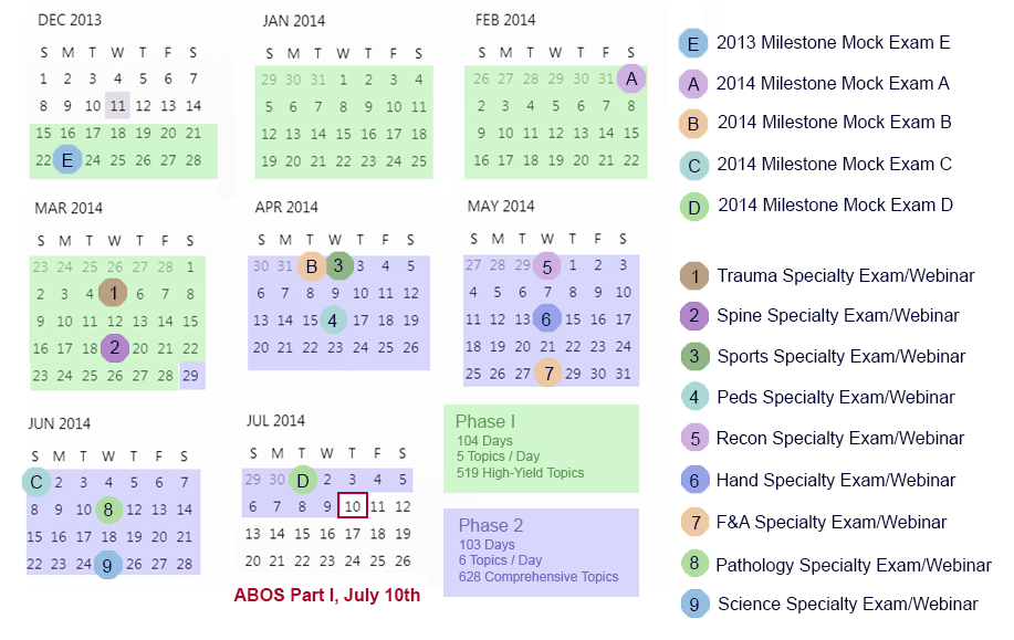 It is time to start preparing for the 2014 ABOS PART I EXAM that will be on July 10th, 2014!The 2014 ABOS Part I 207-Day Study Plan & Orthobullets Virtual Curriculum are a unique online educational program that combines daily reading lists, practice mock exams, and video webinars to make sure you are prepared for the ABOS Part I written exam. The curriculum consists of:I. ABOS Part I 207-Day Study Plan- receive daily emails guiding you through a comprehensive reading lists of topics that have been tested on the OITE and SAE in the pastII. 2014 Orthobullets Virtual Curriculum- Five Never-Been-Seen Milestone Mock Exams - Nine Specialty Exams & 2-Hours Specialty Exam Review Webinars- Access to the 2013 Miller Orthobullets Virtual Curriculum (MOBVC)- High-Yield Review WebinarsClick Link Below to See Schedulehttp://upload.orthobullets.com/topic/5000/images/combined%20schedule%20v3.jpgPricing$79.50 gets you access to 1. ABOS Part I 207-Day Study Plan2. Orthobullets Virtual Curriculum (12-month accessClick link below to read more and PURCHASEhttp://www.orthobullets.com/topicview?id=5000